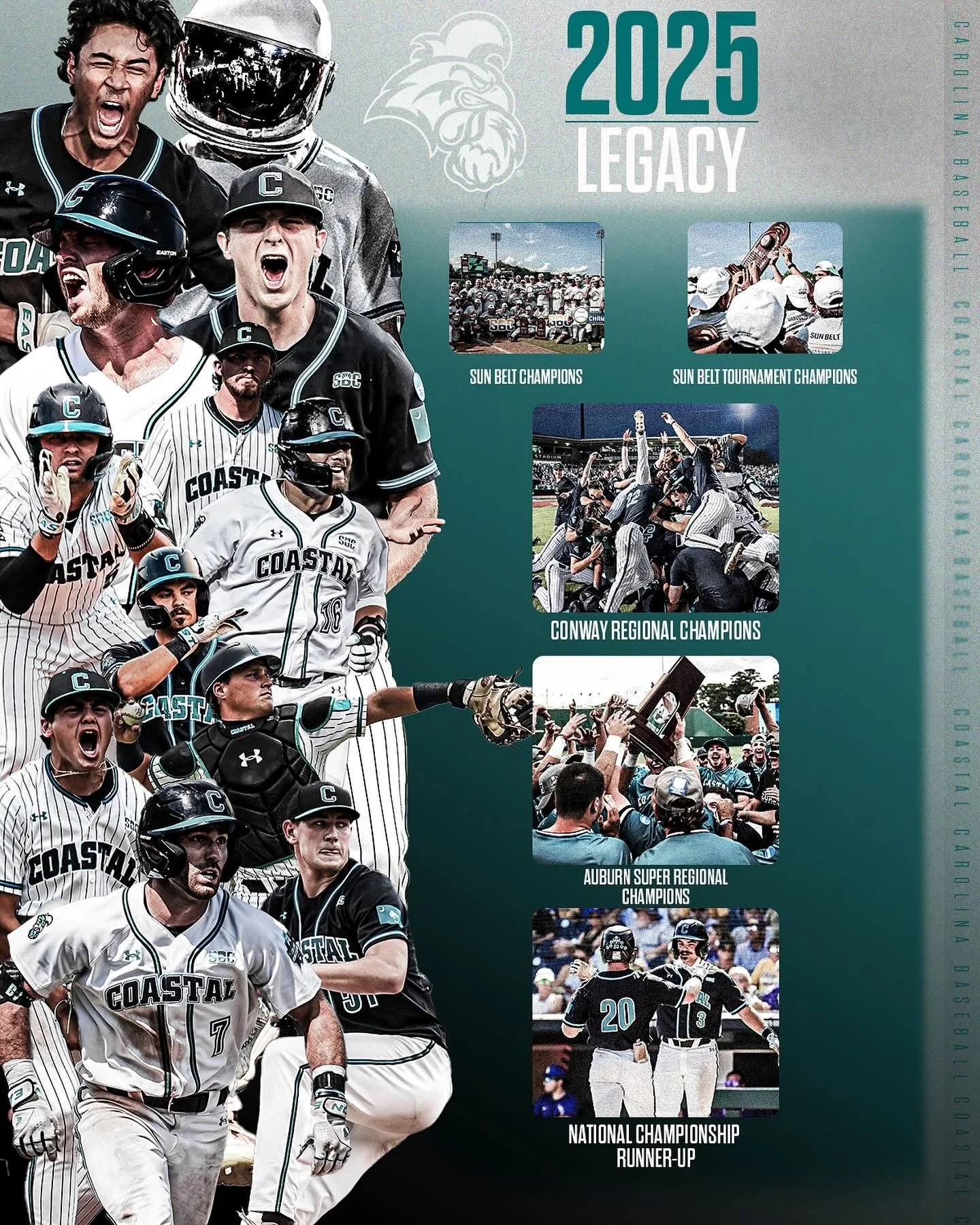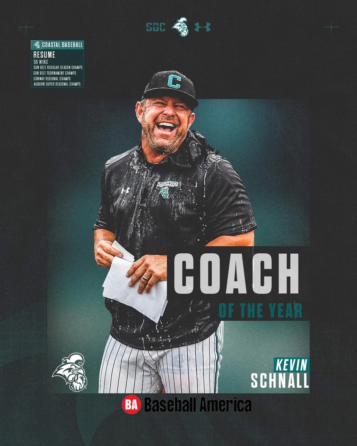 2025 was his rookie year as head coach where he was named Baseball America’s Coach of the Year, ABCA Atlantic Region Coach of the Year. He lead the Chanticleer’s to a record breaking season of 56-13. A season that landed Coastal back in the finals at the College World Series in Omaha.